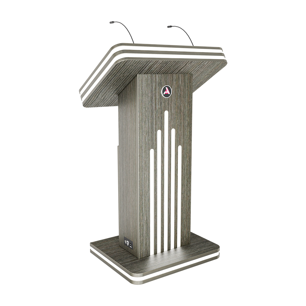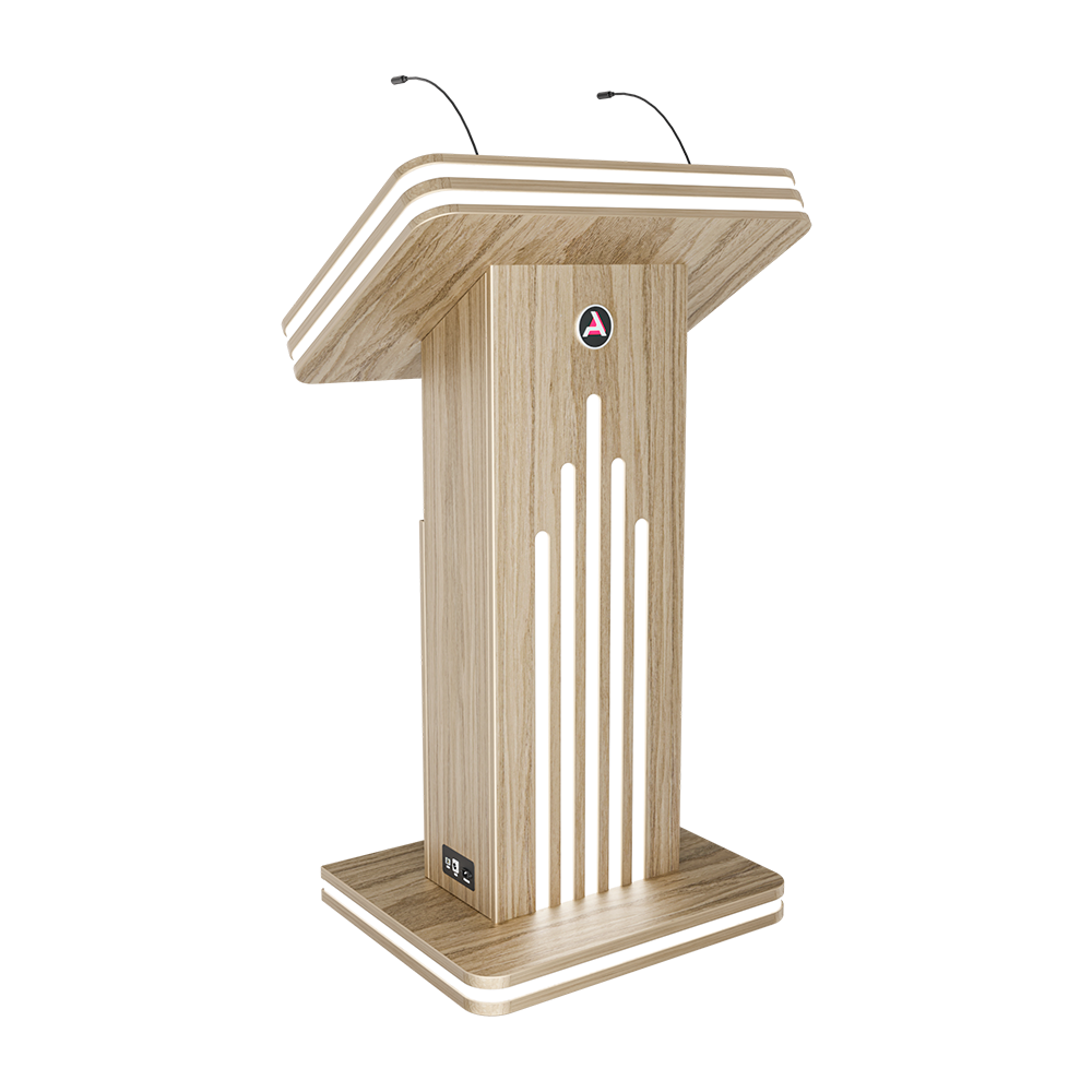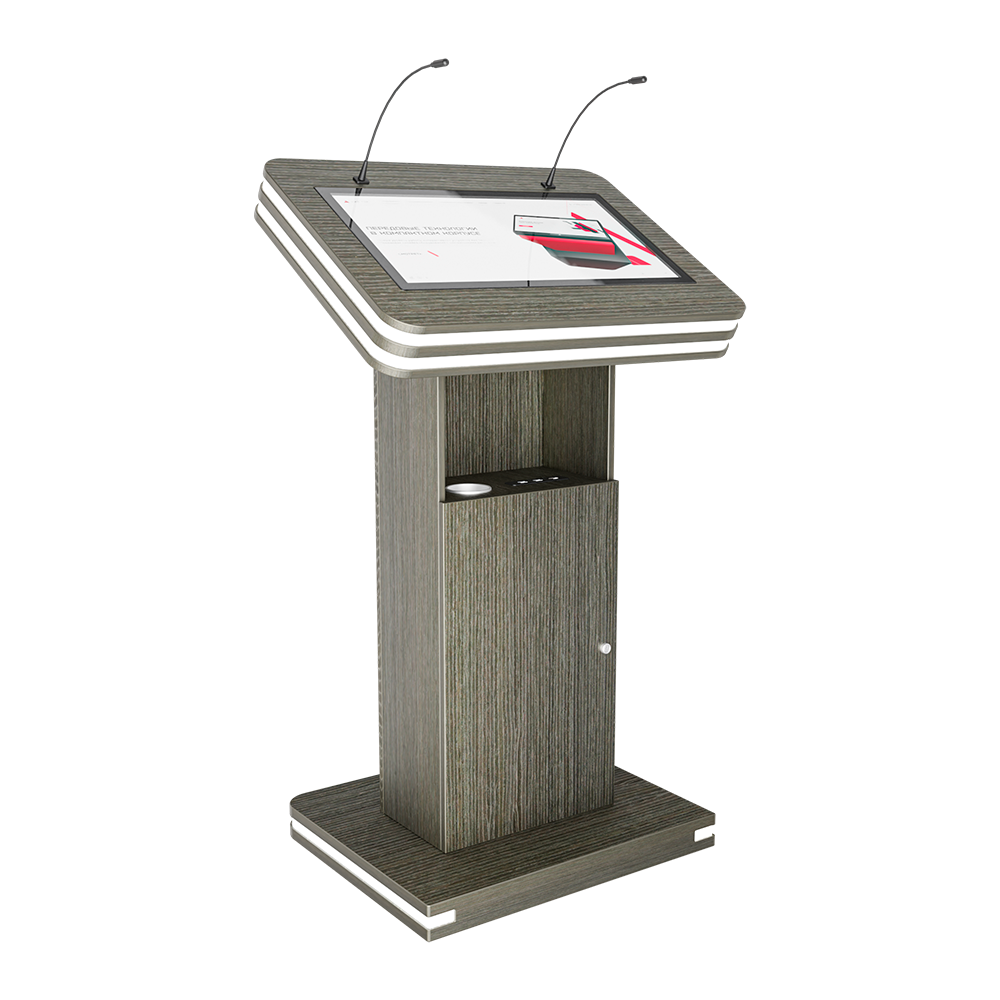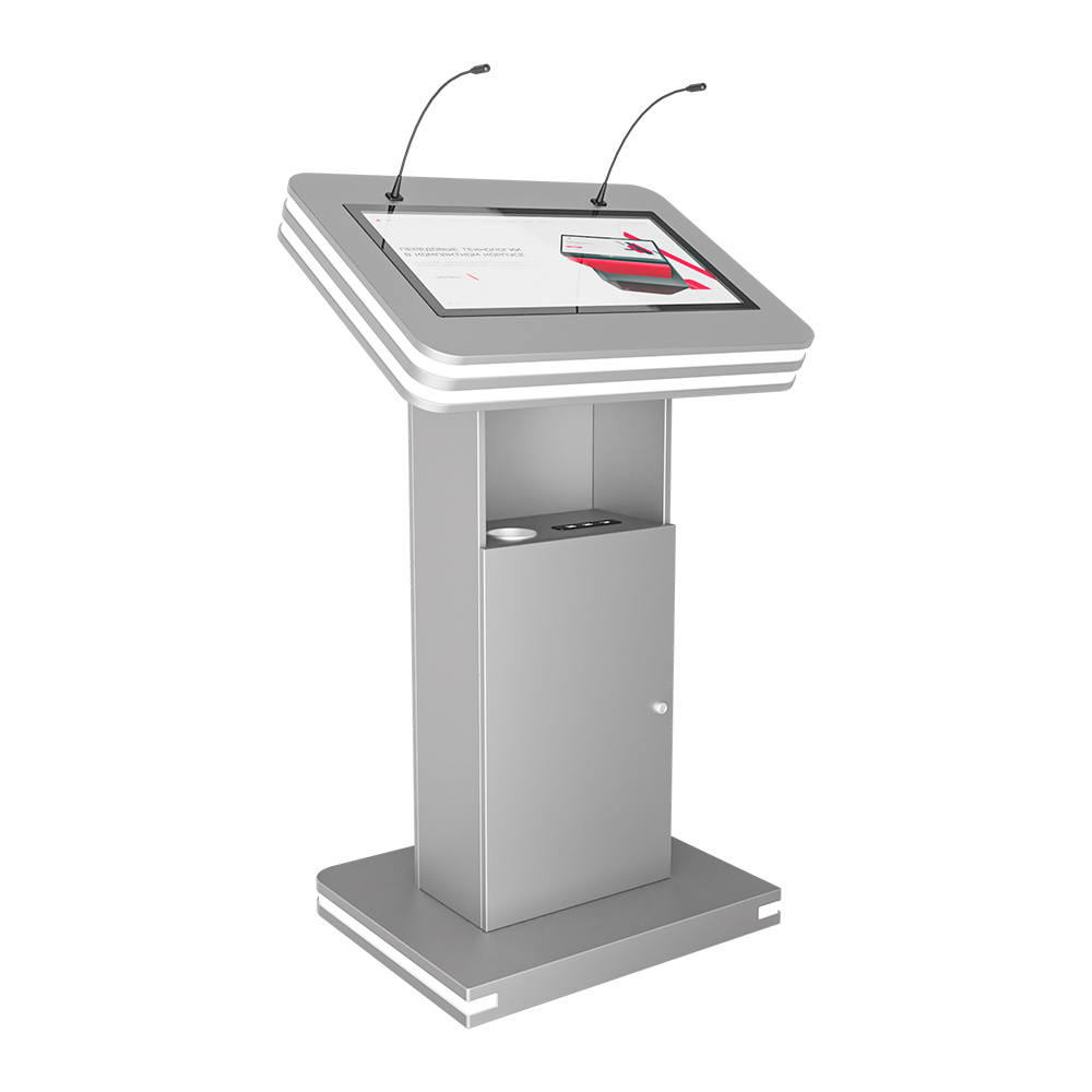 Интерактивная трибуна Light — стильная модель, которая украсит любой бизнес-форум и конференцию. Встроенные микрофоны передают звук на большую аудиторию, удобный интерактивный дисплей с мультитач-системой позволяет отображать необходимую информацию не только для спикера, но и для зрителей, передавая ее на большой экран. Помимо этого, в трибуне есть полочка для воды, а также внешние разъемы. Яркий дизайн корпуса со светодиодным узором не сможет оставить никого равнодушным. Материал МДФ/Сталь Разрешение FullHD Тип сенсора Проекционно-емкостная технология на 10 касаний Процессор Intel Celeron Оперативная память 4 Гб Жесткий диск SSD 120 Гб Wi Fi адаптер Да Операционная система Windows 10 Цвет По согласованию с заказчиком Внешние разъемы USB 3.0/USB 2.0/RJ-45/AUX/HDMI/XLR