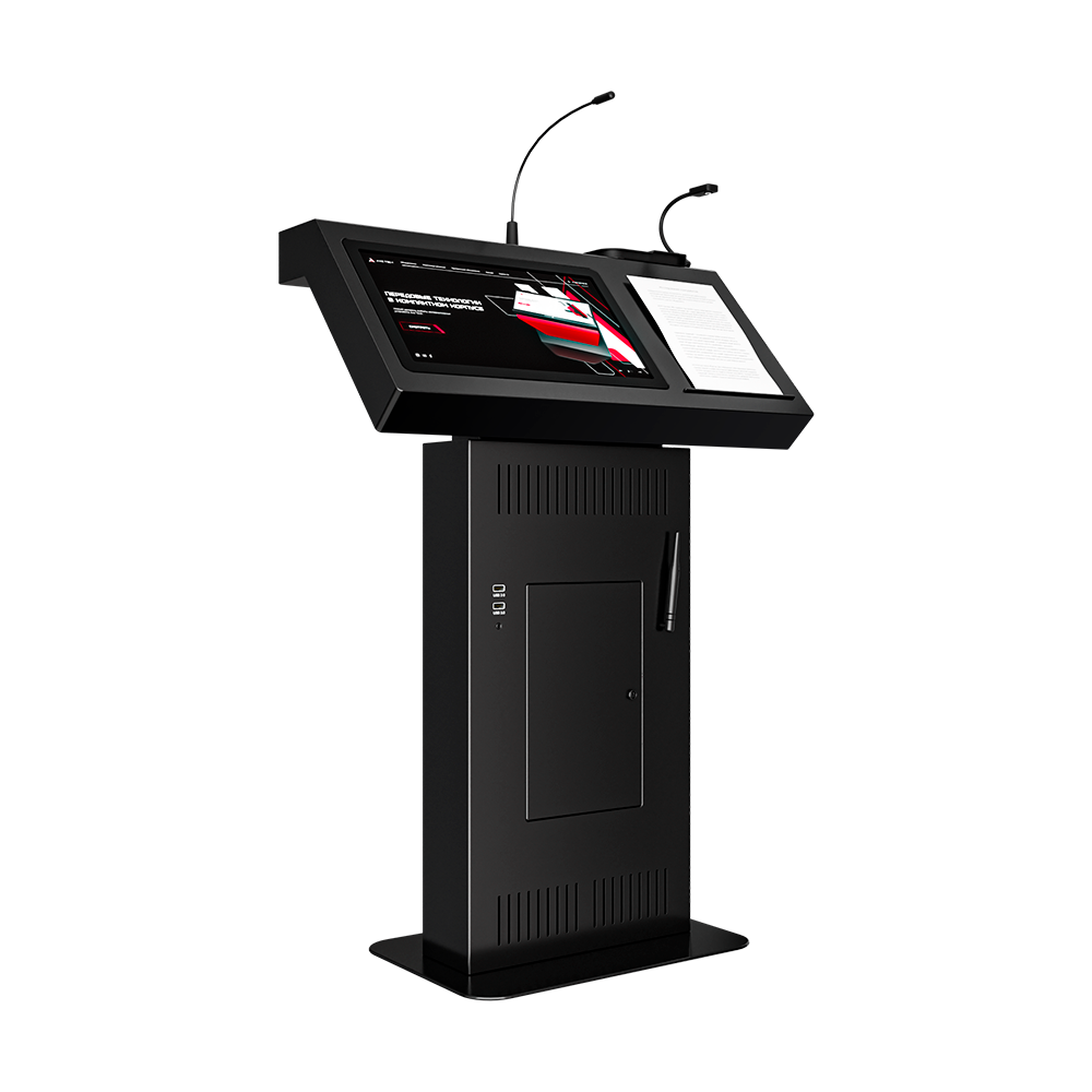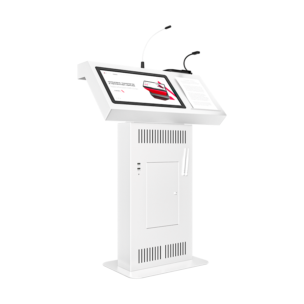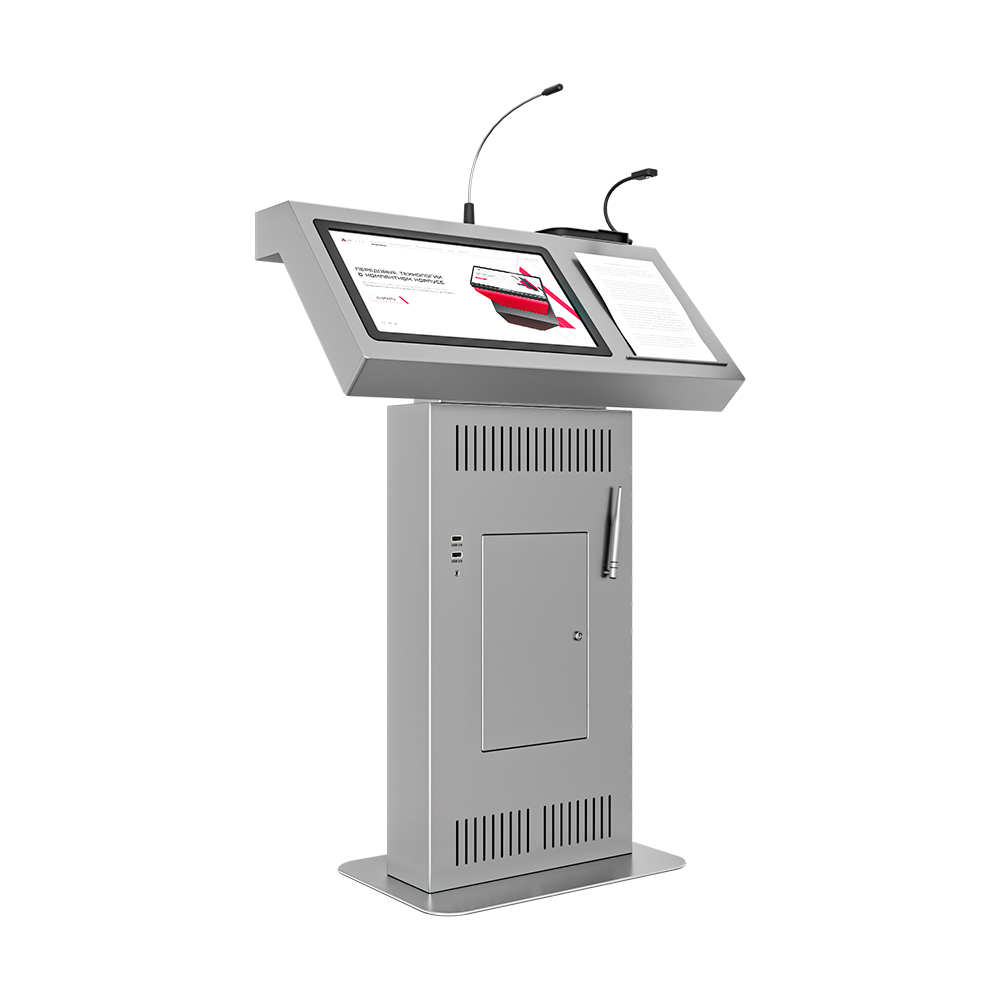 Ультрасовременная модель среди интерактивных трибун, которая включает в себя все самое необходимое для успешного проведения выступлений: профессиональный микрофон для качественной передачи звука, антивандальный корпус, яркий сенсорный экран, документ-камера для отображения необходимых документов на большом экране, дополнительные внешние разъемы. Помимо этого, на трибуне предусмотрено место для размещения документов. Материал Сталь Разрешение FullHD Тип сенсора Проекционно-емкостная технология на 10 касаний Процессор Intel Celeron Оперативная память 4 Гб Жесткий диск SSD 120 Гб Wi Fi адаптер Да Операционная система Windows 10 Цвет По каталогу RAL Внешние разъемы USB 3.0/USB 2.0/RJ-45/AUX/HDMI/XLR